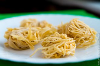 Раскатайте шар из теста в колбаску и разрежьте ее на несколько шариков поменьше. Раскатайте каждый шарик в тонкий прямоугольник, обильно присыпая мукой и поверхность стола, и само тесто с верхней стороны – чтобы быстрее подсыхало и не липло к столу и скалке. Раскатав все тесто, вооружитесь острым ножом и нарежьте его полосками желаемой толщины (для спагетти и лапши – совсем узкими, для тальятелле – пошире), прямоугольниками для лазаньи или бешбармака, или любой другой формы, которая вам нравится. Аналогичным образом готовится тесто для всех разновидностей равиоли: их лучше приготовить сразу, а вот все остальные разновидности макарон стоит сперва подсушить, а затем убрать в холодильник или заморозить.